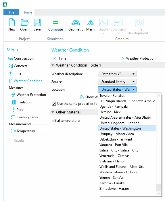 Figure 4. Forecasted weather conditions can be selected from a drop-down menu, or the user can specify a location with longitude and latitude.