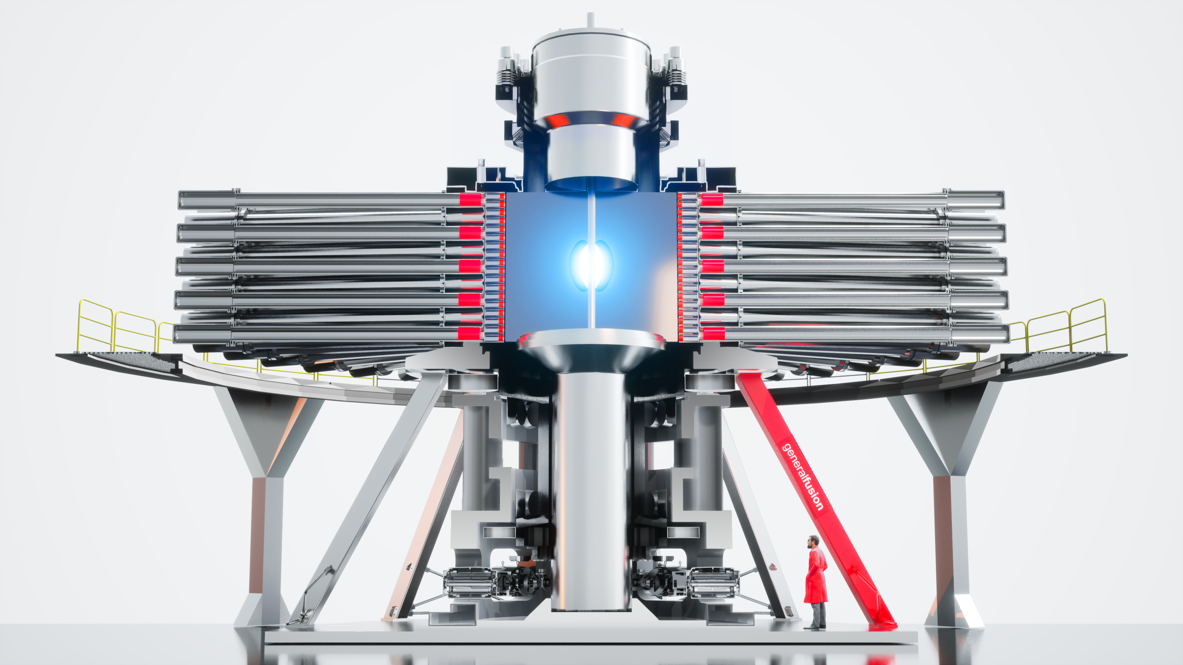 LM26 is designed to inject a spherical tokamak plasma into the chamber and compress it using a solid lithium liner to reach fusion-relevant plasma temperatures. During the compression, a toroidal magnetic field is generated by an axial current flowing in the hourglass structure that keeps the plasma confined and stable. This process creates the plasma temperatures and densities that lead to the fusion of plasma ions and the release of energy in the form of neutrons.