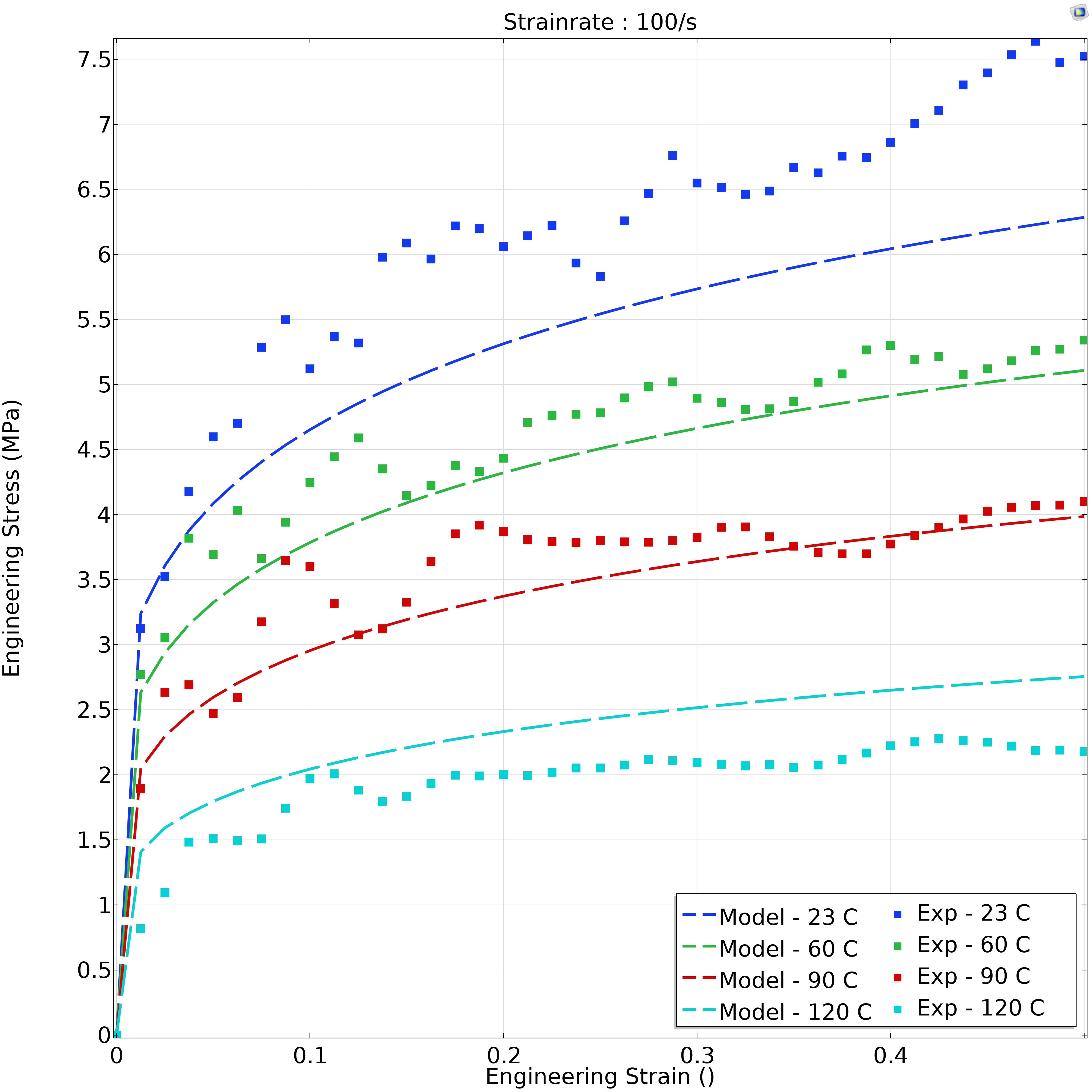 To measure the deformation of the liners, General Fusion developed a structured light reconstruction (SLR) technique. This involved the use of sheets of laser light to extract the velocity at multiple points in the liner. General Fusion also used photon Doppler velocimetry to measure the velocity of the center point of the lithium liner. This combination enabled General Fusion to recreate the deformation observed in the physical experiments and compare that to the simulation results for validation. They then used that rate- and temperature-dependent material model (Figure 5) in subsequent simulations of the plasma compressor and found good agreement between the test data and the data acquired through previous tests.