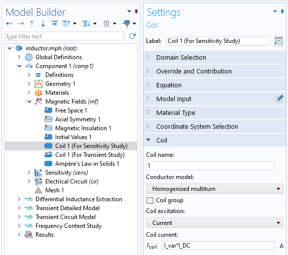 where L_{ij} is the secant inductance and is computed by default whenever a Coil feature is used. On the other hand, computing the differential inductance takes some extra steps.